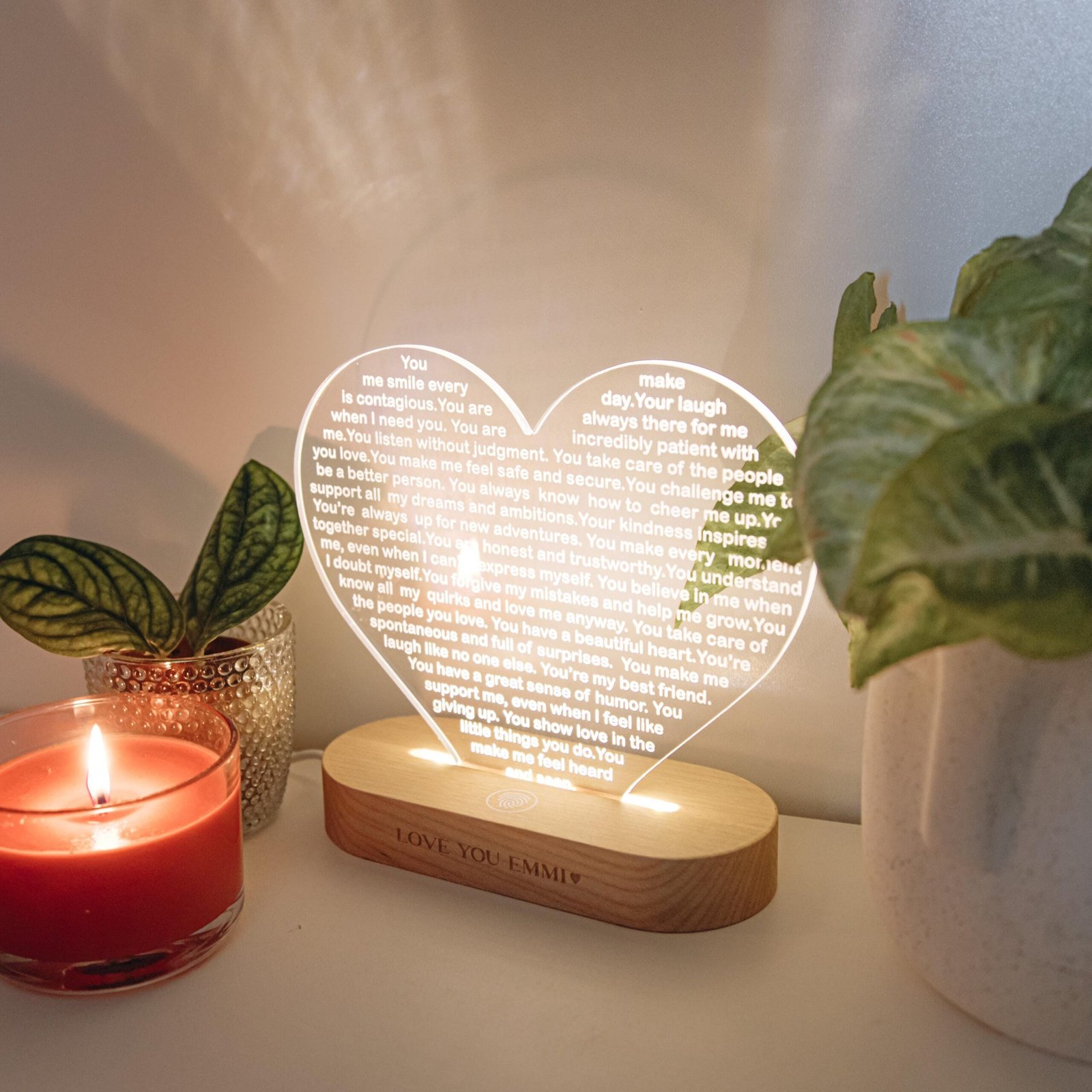 Light up her world with a custom heart night light—a perfect Christmas gift, a thoughtful 30th birthday surprise, a romantic gesture, or a touching anniversary present. Let love shine bright in the form of this personalized night light that symbolizes your deepest affections and conveys your heartfelt emotions in a warm and luminous way. Illuminate her heart and space with a gift that radiates love and togetherness.